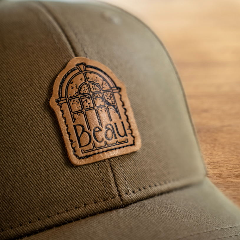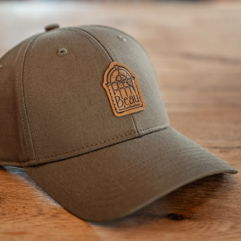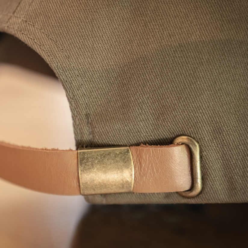 The embossed leather patch and brushed brass metal detailing echo the vintage aesthetic for which the chateau embodies. The hat features mid-weight olive canvas and a full-grain vegetable-tanned leather patch. The fit is relaxed, unstructured, and intended to wear in beautifully over time.